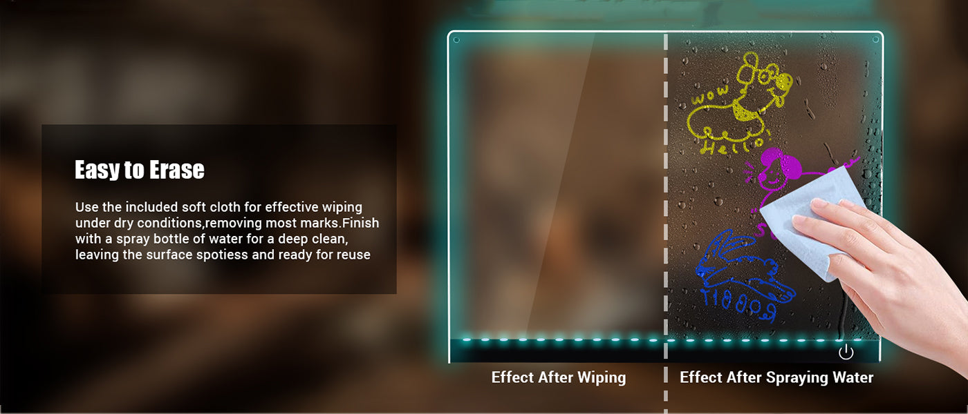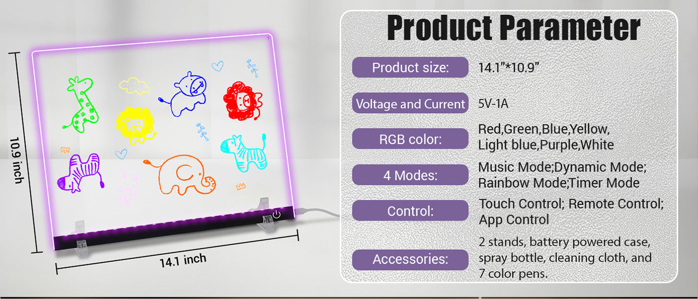 - Flexible Display with Complete Accessories: Easily display your board using the included invisible stand (desktop) . Complete set includes: 2 stands, battery powered case, spray bottle, cleaning cloth,and 7 color pens. Allows you to create colorful and vibrant designs directly from the light board. Provides everything you need for ease of use and versatility.